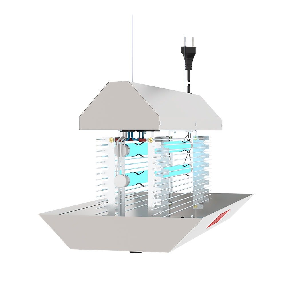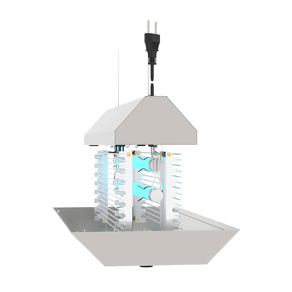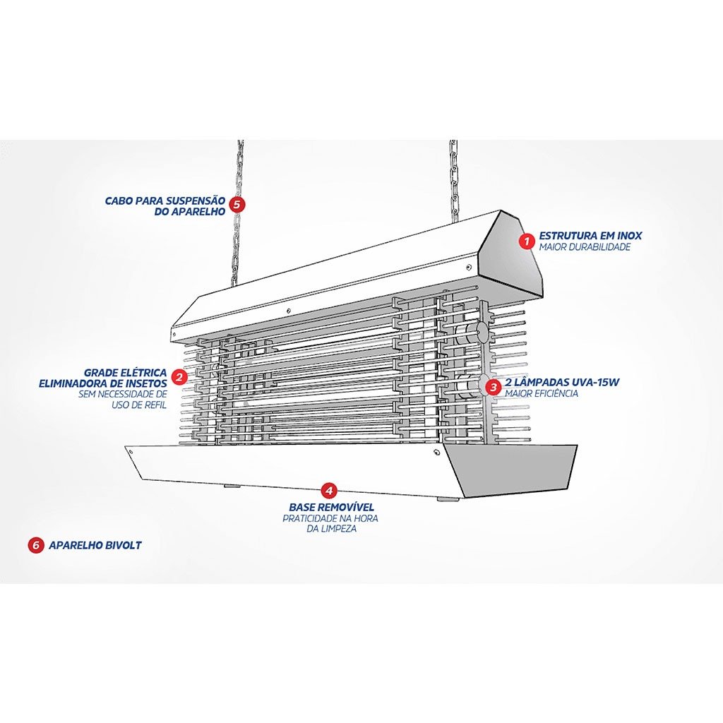 – Feita em aço inox e alumínio, atrai insetos voadores como moscas e mosquitos, eliminando-os rapidamente através de uma pequena descarga elétrica.